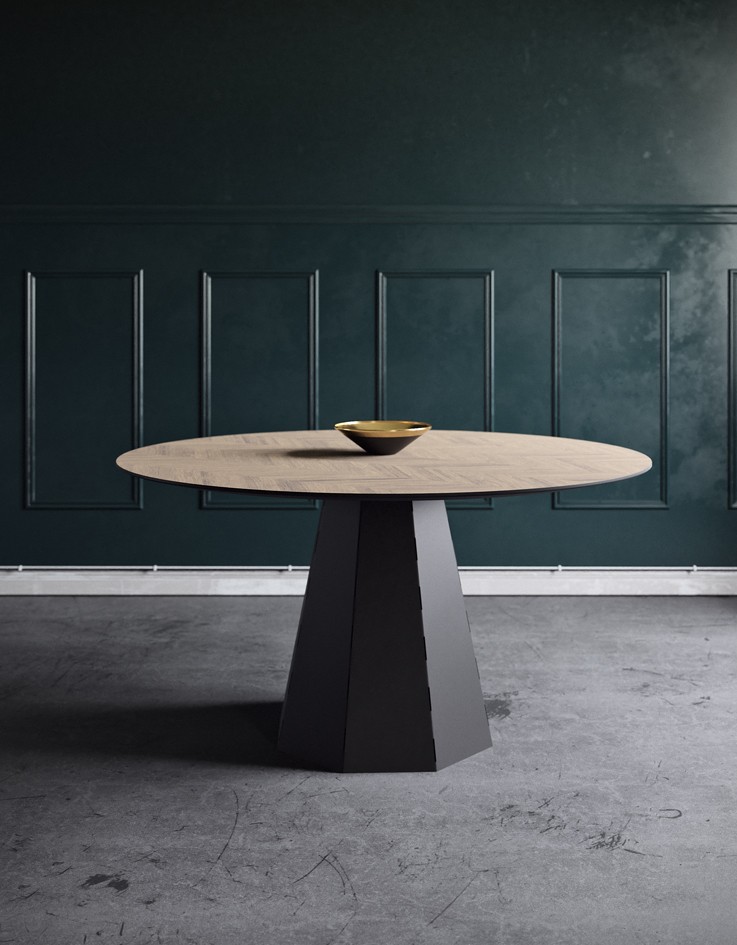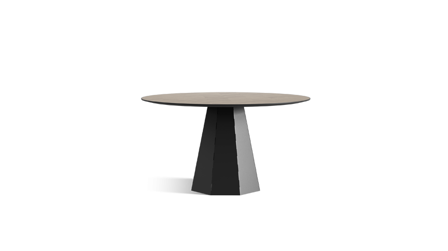 Στρογγυλό τραπέζι με οκτάγωνη μεταλλική βάση. Διατίθενται με διάφορες επιφάνειες.